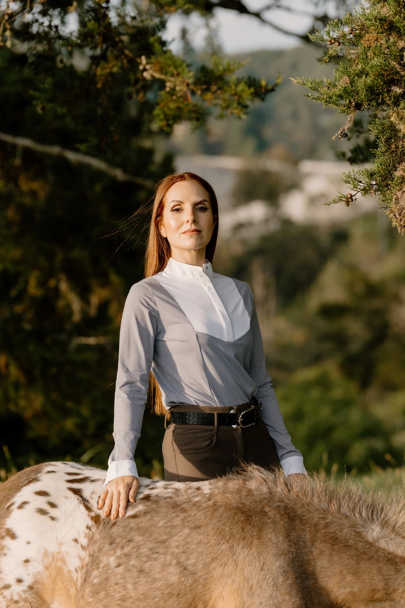 Inspired by the classics yet never missing the opportunity to show her true colors, Luna paints the perfect show-ready ensemble with her unique palette of tradition and modernity! Her mix of on-trend hues with the classic white bib front is perfect to breathe colour into your show attire! Speaking of breathing, the non-sheer mesh on the sleeves and back ensures optimal breathability to keep you ultra-cool even in the heat of intense performances. Her front hidden snap placket and the white logo add a touch of sleekness while delicately highlighting your impeccable taste.