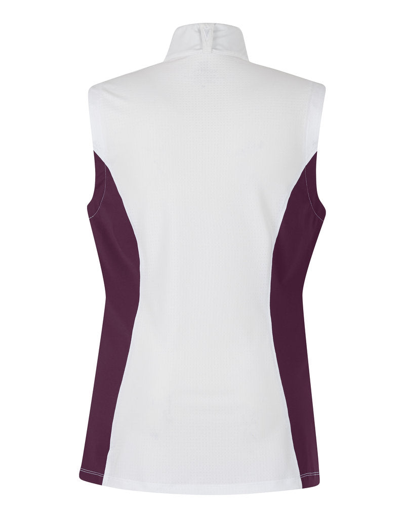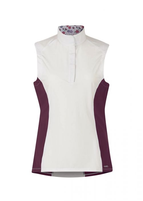 This sleeveless top minimizes layers under a show coat keeping riders cool with an Ice Fil® mesh back panel and wicking Hydrocool® technology. Lightweight, double-knit compression fabric covers and flatters with stylish princess seams and functional four-way stretch. Exclusive Kerrits print contrasts beautifully with crisp white collar. Colored side panels add style riders will keep on even after the victory gallop.