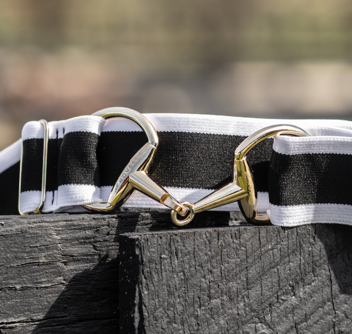 The Novella Snaffle Belts in Black -- Black Beauty 2 inch, Black and White Stripe 1.5 inch, Glimmer Black 1.5 inch - features an etched gold snaffle with the Novella logo to match every one of your Novella styles. This piece really ties your Novella look together! The elastic is either 2 or 1.5 inches wide for great support and stunning finished look.