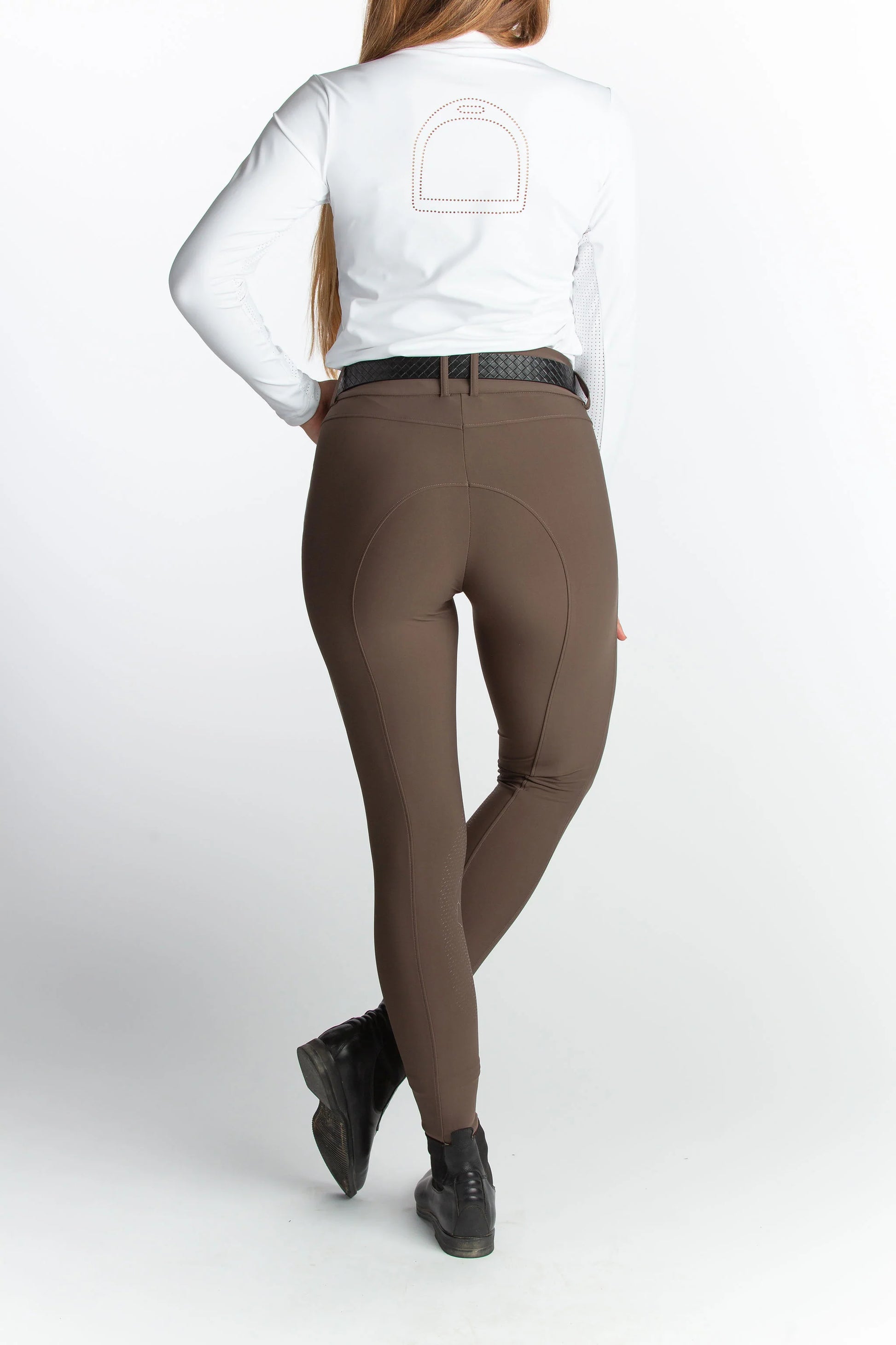 Ramy will bring you the confidence to crush your goals both in and out of the saddle. Her smoothing luxe fabric will hug your body with its four-way-stretch and make you feel put together while still moving in ultimate comfort. With her flattering high waist, Ramy gives an ultra chic look for your time at the barn or running errands and is trimed with a delicate rose silicone grip for a beautiful feminine touch to any outfit.